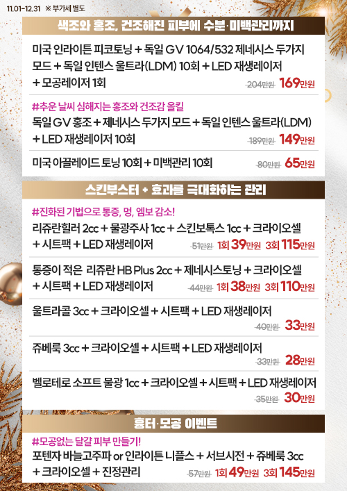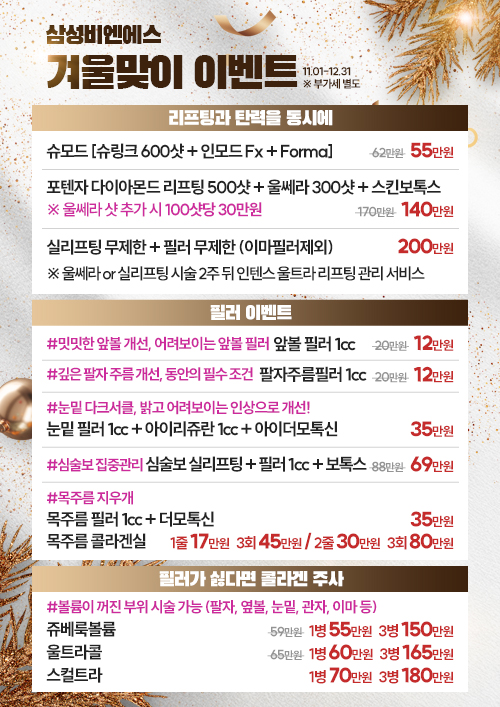 종료 겨울맞이 이벤트 안내 페이지 정보 작성자최고관리자 작성일23-11-24 17:05 조회1,030회 댓글0건 이전글 수능이벤트 다음글 화요일 리프팅데이! 수요일 보톡스데이! 목록 본문 안녕하세요, 삼성 비앤에스의원입니다. 추운 날씨와 건조함에 피부 트러블이 잦아지는 겨울, 촉촉하고 탄탄하게 빛나는 피부로 관리하세요! 댓글 목록 등록된 댓글이 없습니다. 댓글등록 이전글 수능이벤트 다음글 화요일 리프팅데이! 수요일 보톡스데이! 목록