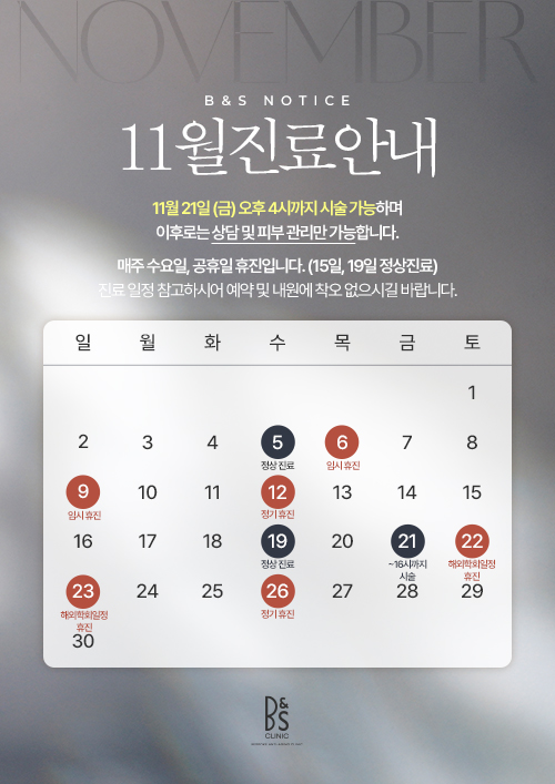 삼성비앤에스 2025년 11월 진료일정 페이지 정보 작성자최고관리자 접수일자2025-11-04 19:45:12 진료과목 연락처 관련링크 이전글 삼성비엔에스의원 1월 휴진 안내 다음글 삼성비엔에스의원 12월 휴진 안내 목록 본문 진료일정 공지드립니다. 예약 및 방문에 참고 부탁드립니다. 댓글 목록 등록된 댓글이 없습니다. 댓글등록 이전글 삼성비엔에스의원 1월 휴진 안내 다음글 삼성비엔에스의원 12월 휴진 안내 목록