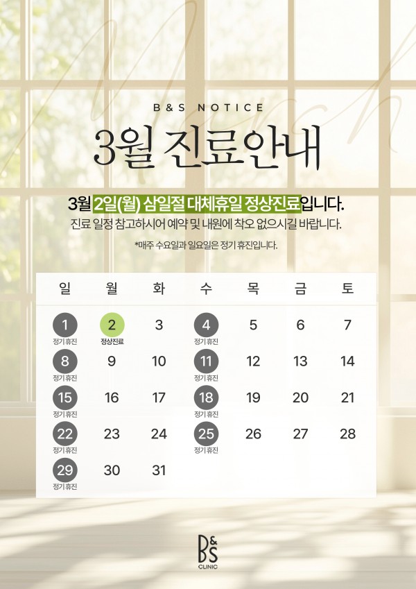 삼성비앤에스의원 26년 3월 진료일정 페이지 정보 작성자최고관리자 접수일자2026-02-26 11:07:32 진료과목 연락처 관련링크 다음글 삼성비앤에스 2026년 2월 진료일정 목록 본문 . 댓글 목록 등록된 댓글이 없습니다. 댓글등록 다음글 삼성비앤에스 2026년 2월 진료일정 목록